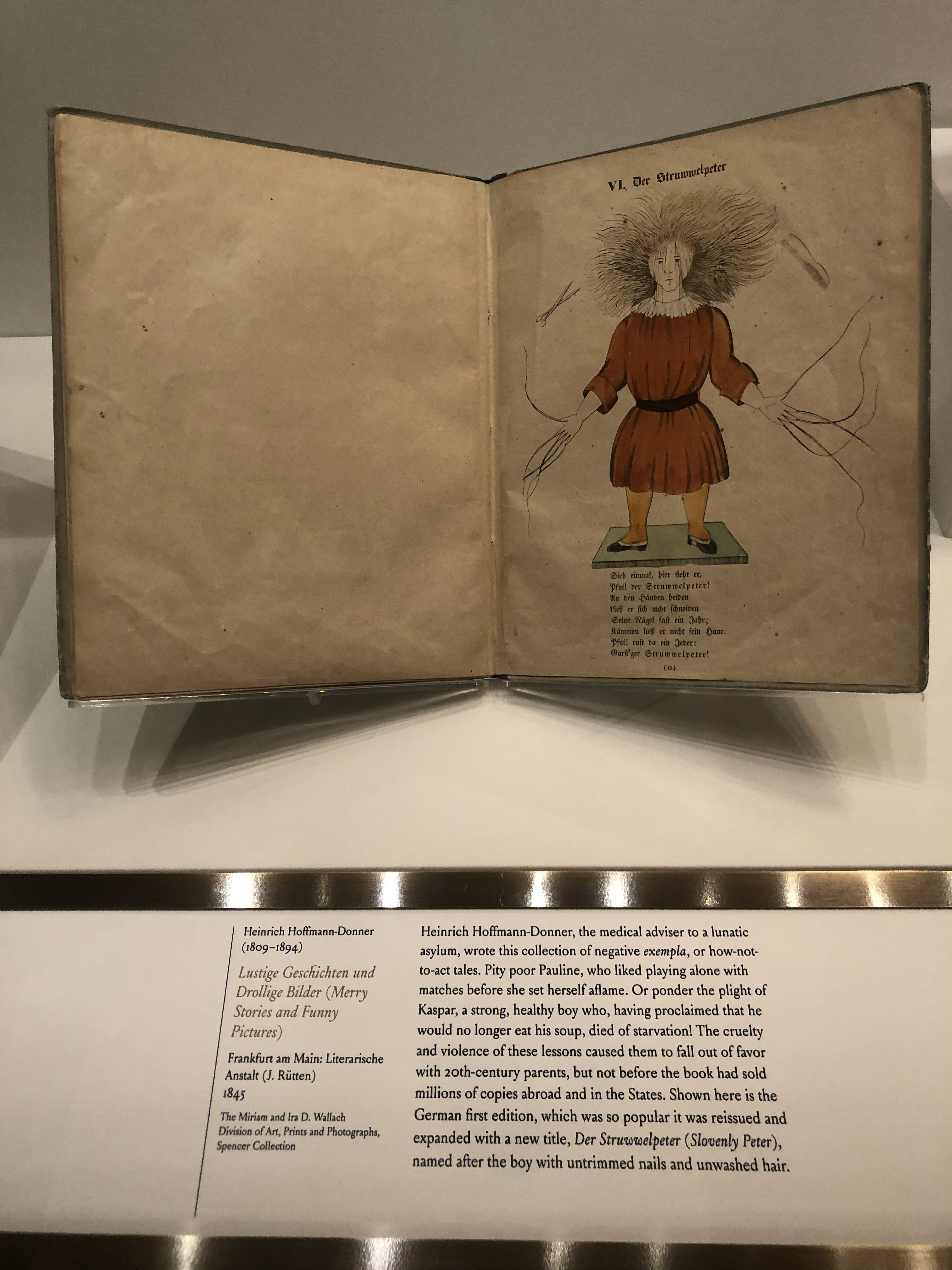 Lo primero que llamó mi atención fue este libro de 1845 que es un compendio de ejemplos negativos, una colección de relatos que advierte a los niños de lo que puede ocurrirles si no siguen las normas. La descripción es graciosísima y aún más gracioso me pareció lo políticamente incorrecto que resultaría en estos tiempos en los que todo se toma literal y casi nadie aprecia el humor negro.