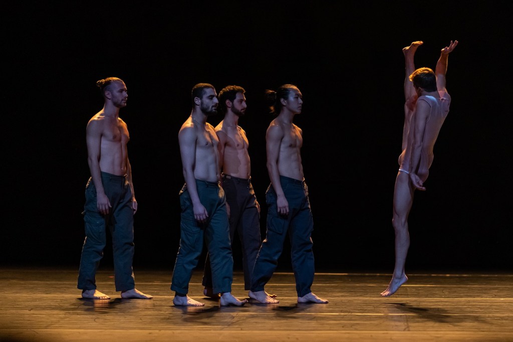A los cuatro bailarines del principio, que conforman una suerte de coro, se les suma otro intérprete masculino. Lleva un traje ceñido del mismo color de su piel, por lo que da la impresión de estar desnudo. El vestuario y sus movimientos sugieren a un contorsionista de circo. Su extravagancia contrasta con los coristas, que se mueven acompasadamente y en perfecta sincronía, como si flotaran. Sus movimientos son limpios pero sencillos, y la técnica revela los años de entrenamiento sin necesidad de aspavientos.